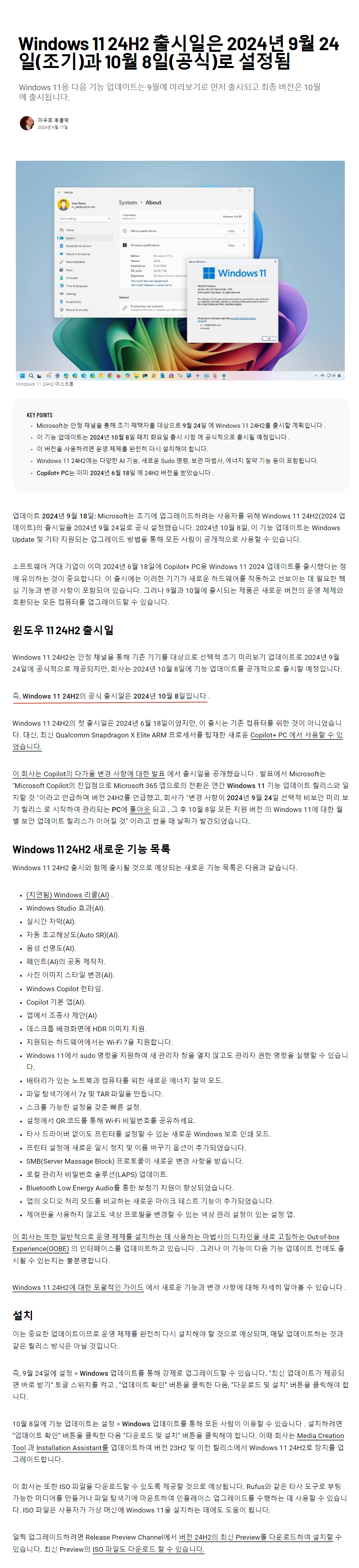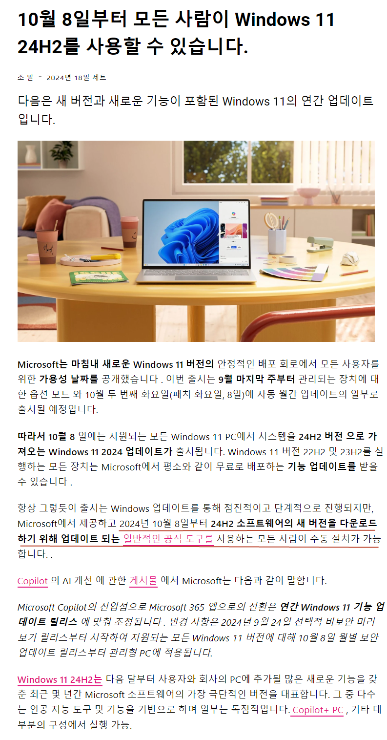 2024년 10월 8일부터 24H2의 새 버전을 다운로드하기 위해 업데이트 되는 일반적인 공식 도구를 사용하는 모든 사람이 수동 설치가 가능