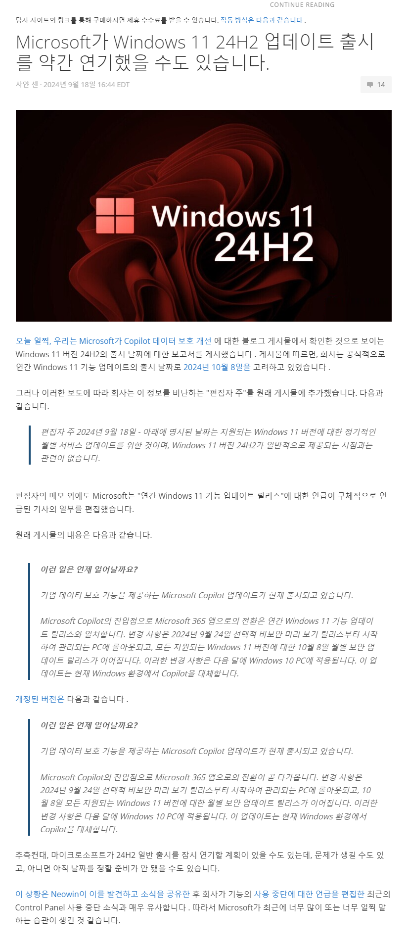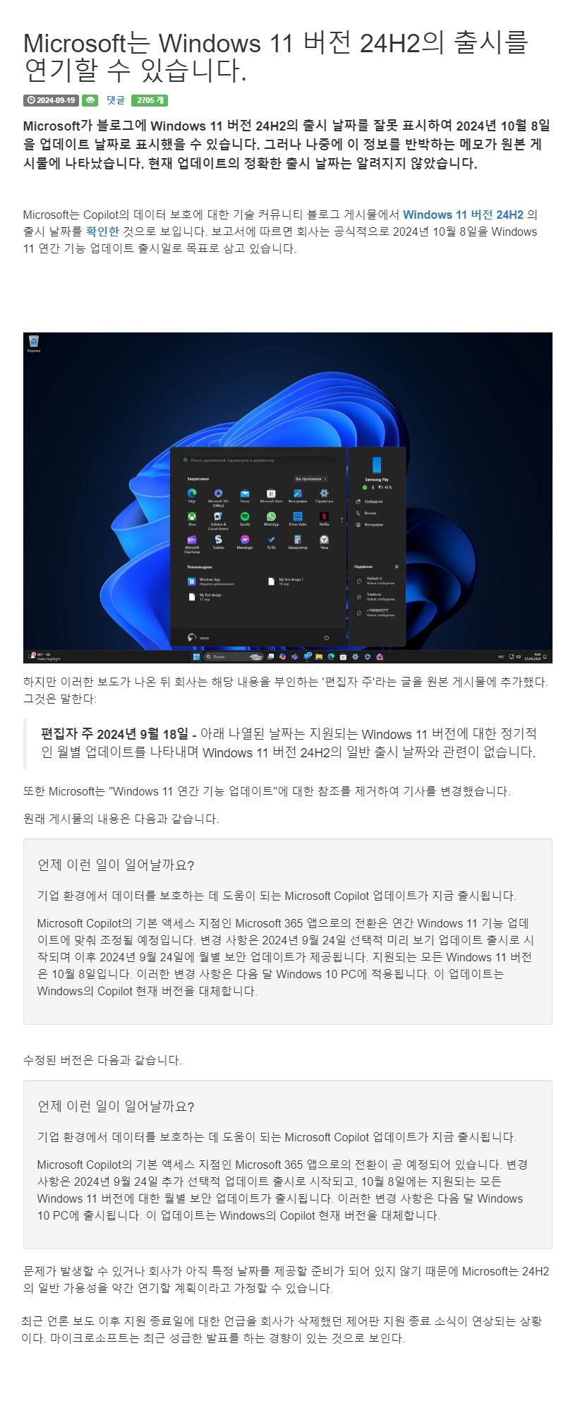 | Windows 11 24H2는 10월 8일 정식 출시될 예정 [연기됨]🩹💊 (5) | 2024.09.18 |