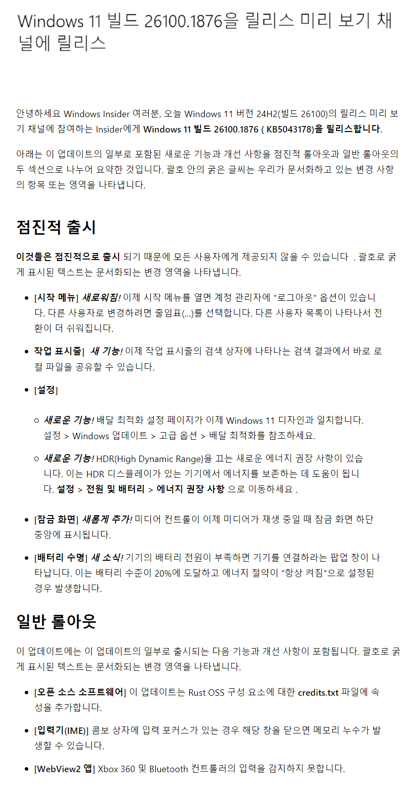○ 미리보기 채널 [Release Preview] = Windows 11 : 빌드 26100.1876 (= 참가자 빌드)