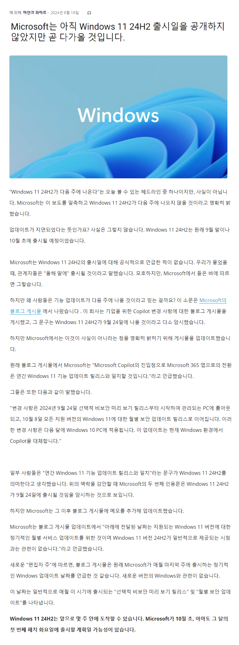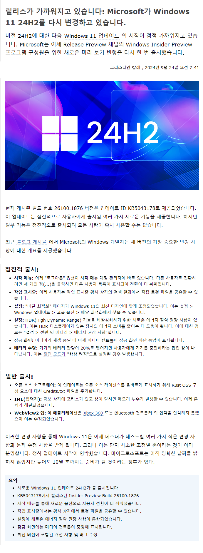 | Windows 11 24H2는 10월 8일 정식 출시될 예정 [연기됨]🩹💊 (5) | 2024.09.18 |