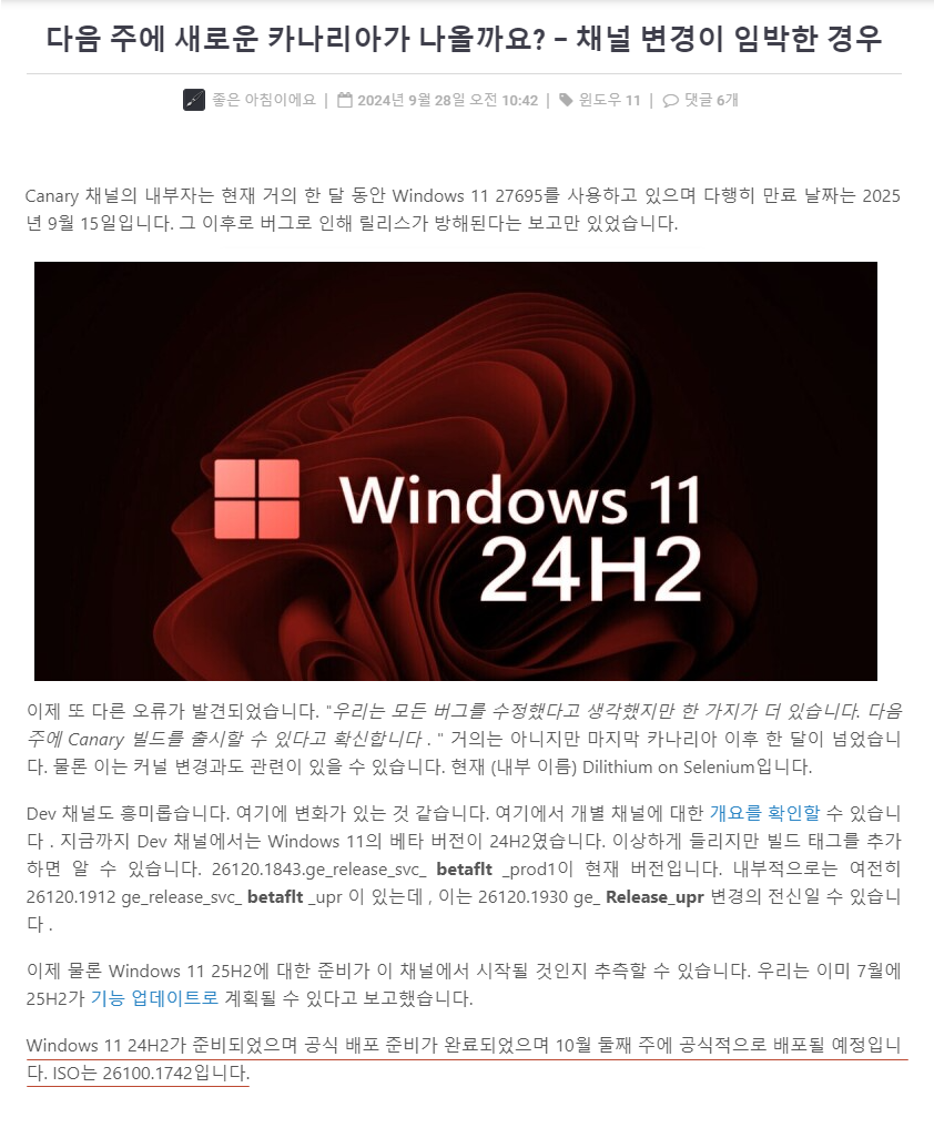 - Windows 11, 24H2 RTM의 누적 업데이트 파일(KB5043080) : 26100.x → 26100.1742 (= 일반 사용자용 월간 보안 업데이트)2024.09.11