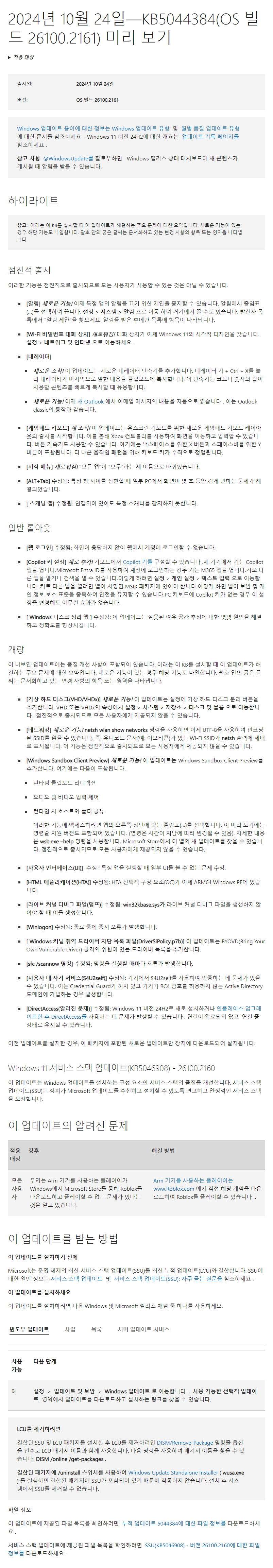 KB5044384 = 최신 누적 업데이트(26100.2161) (Last Cumulative update : LCU) (2024-10-24)