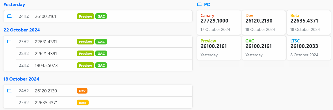 ○ 미리보기 채널 [Release Preview] = Windows 11 : 빌드 26100.2152 (= 참가자 빌드)