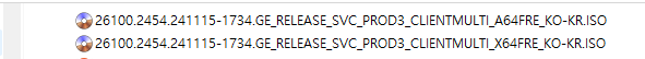아래 파일은 UUP dump에서 배포하는 스크립트를 이용해서 MS에서 배포하는 파일(ESD, cab파일)로 만든 순수 ISO 파일입니다.