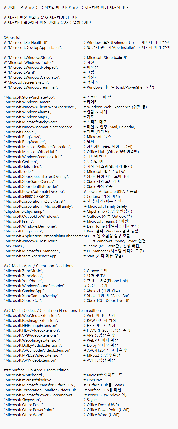제거하지 말아야할 앱은 앞에 # 문자를 넣어주세요