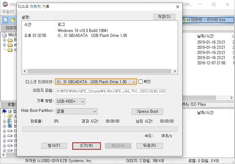 PE ISO 파일을 UltraISO 프로그램으로 USB에 구워보겠습니다.