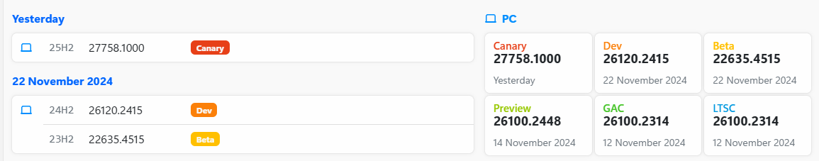 ○ 개발자 채널 [Dev] = Windows 11 : 빌드 26120.2415 (= 참가자 빌드)