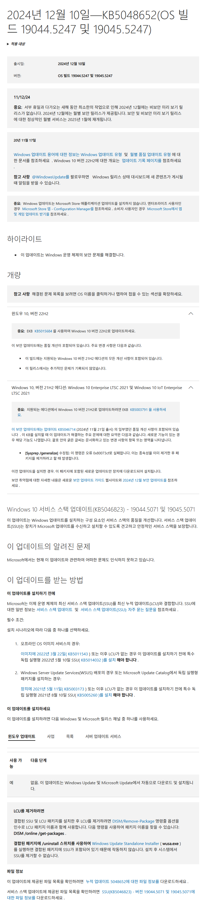 KB5048652 = 최신 누적 업데이트(19044.5247 / 19045.5247) (Last Cumulative update : LCU) (2024-12-10)