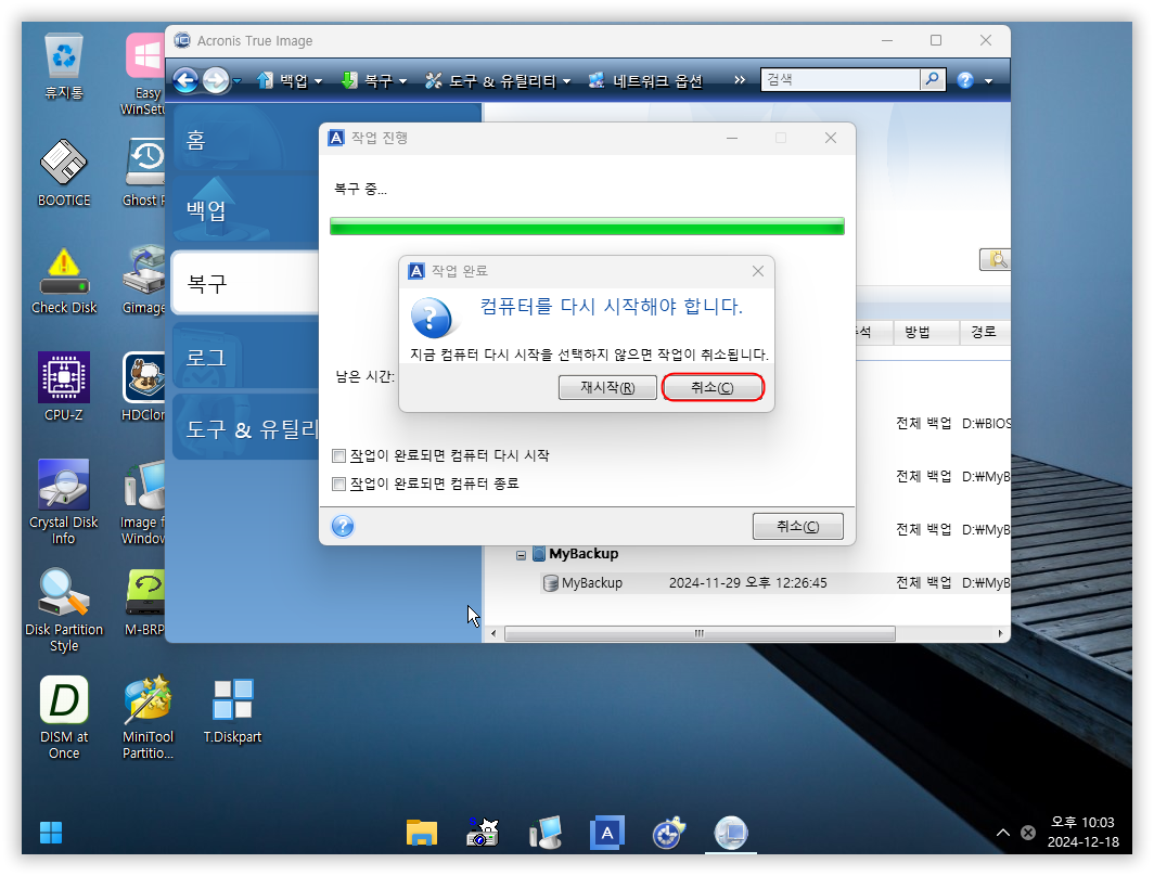 [복구 완료] 메시지 대신에 [재부팅] 메시지 나옵니다. 그냥 취소하시면 됩니다. (복구실패로 나오지만 복구 완료된 겁니다)