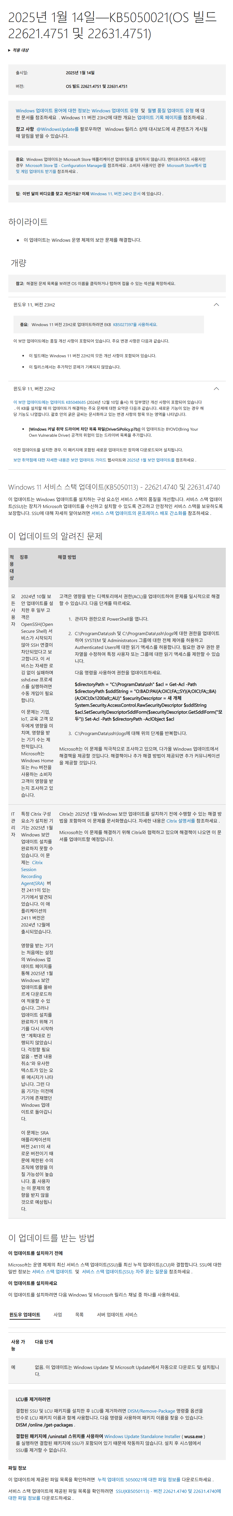 KB5050021 = 최신 누적 업데이트(22621.4751 / 22631.4751) (Last Cumulative update : LCU) (2025-01-14)
