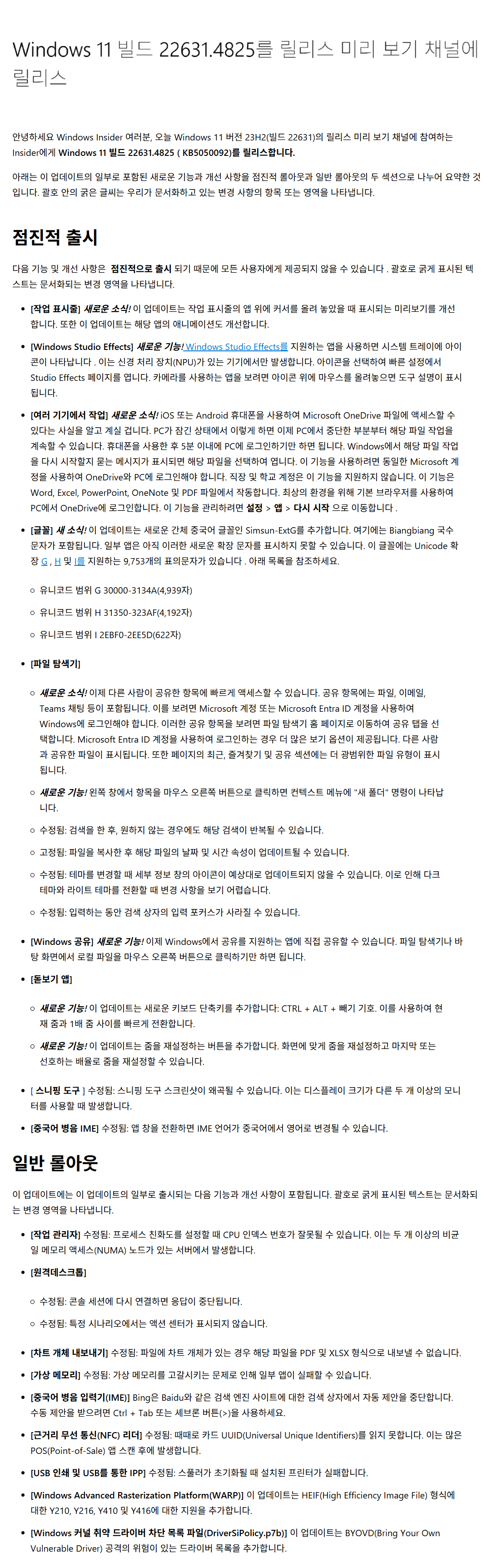 2025-01 Windows 11 Version 22631에 대한 누적 업데이트(KB5050092) : 22631.x → 22631.4825