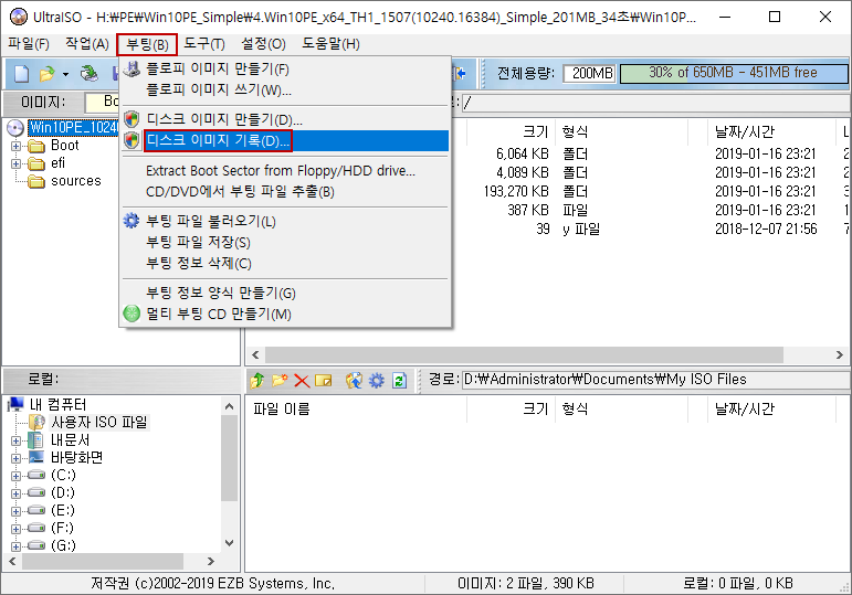 3) 메뉴에서 → 부팅 → 디스크 이미지 기록 → 쓰기