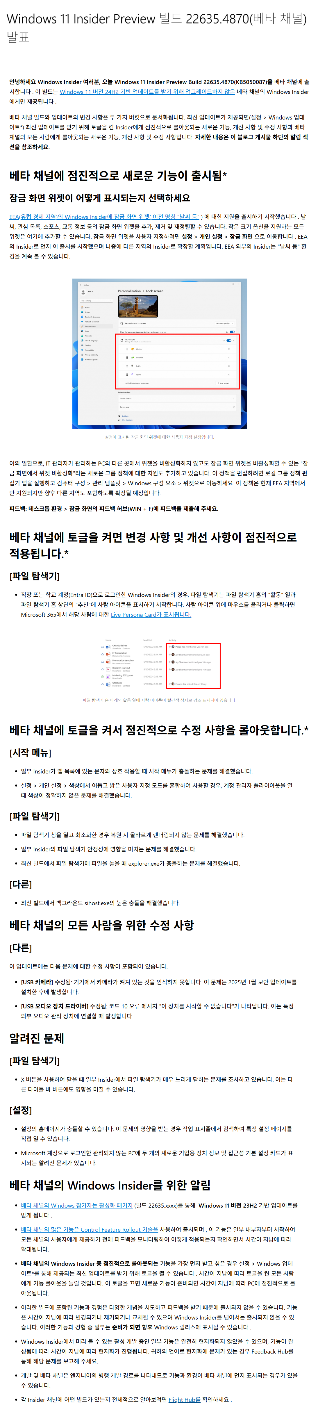 ○ 베타 채널 [Beta] = Windows 11 : 빌드 22635.4870 (= 참가자 빌드)