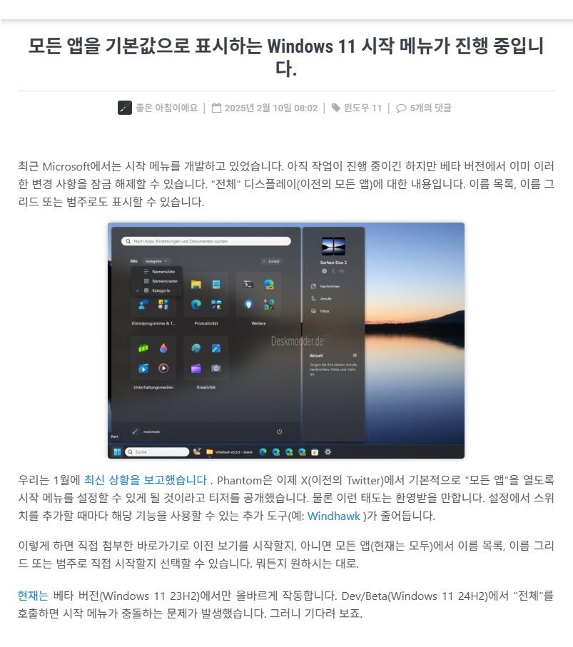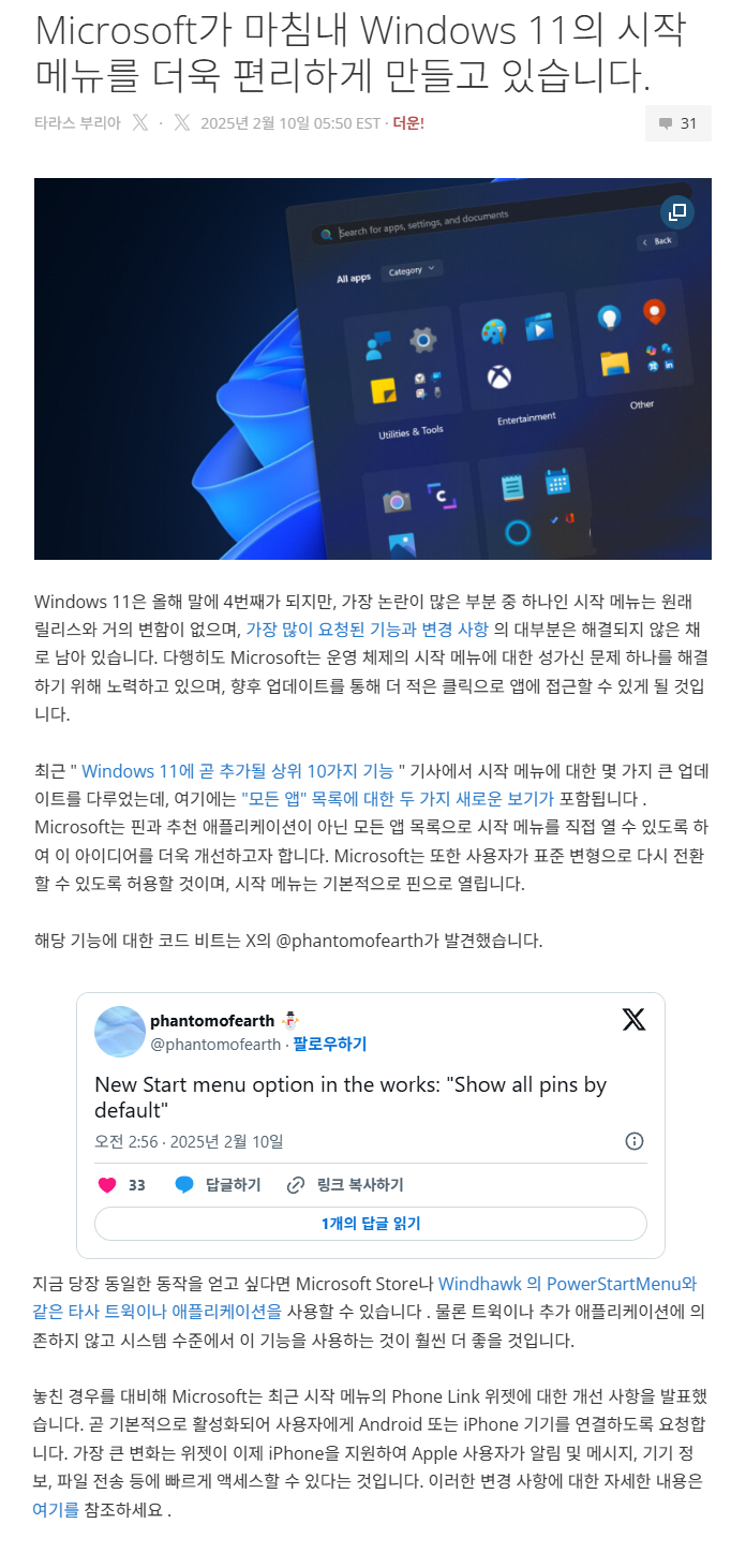 | MS, Windows 11에서 시작 메뉴에서 '추천' 섹션을 제거할 예정 (2) | 2025.02.14 |
