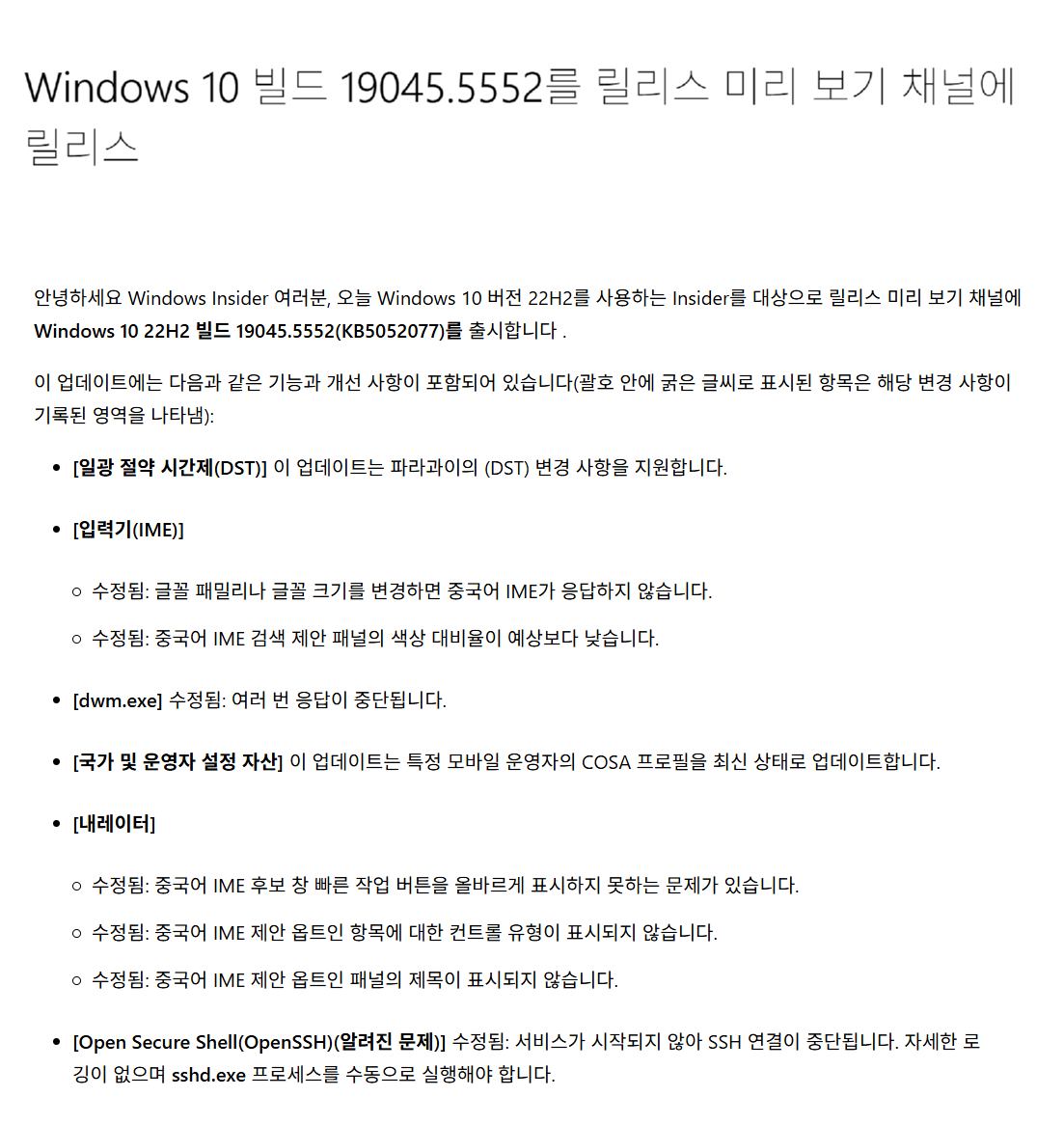 ○ 미리보기 채널 [Release Preview] = Windows 10 : 빌드 19045.5552 (= 참가자 빌드)