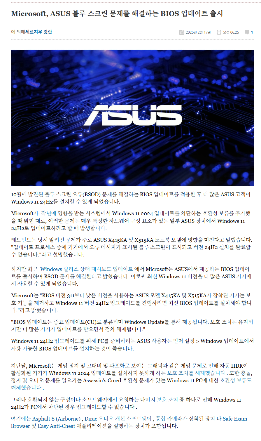 " MS는 당시 알려진 문제가 주로 ASUS X415KA 및 X515KA 노트북 모델에 영향을 미친다고 말했습니다."