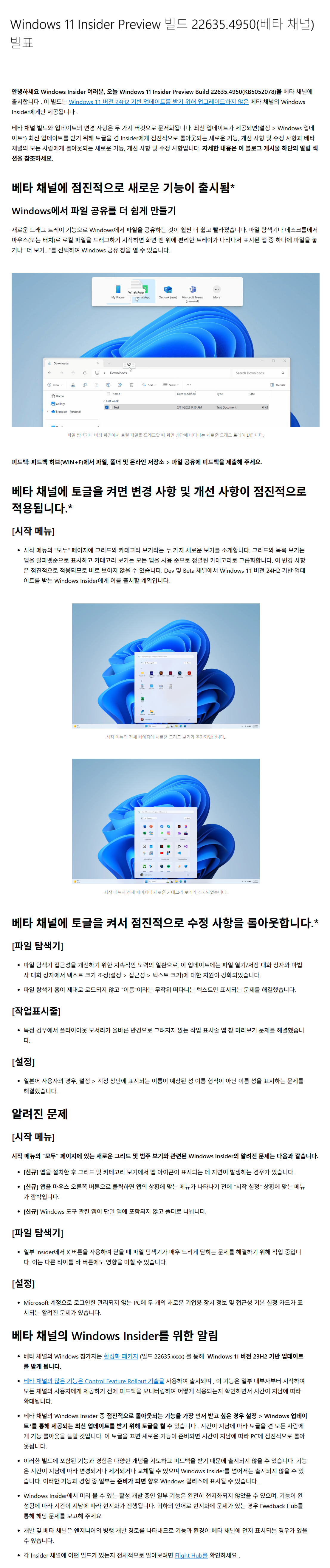 ○ 베타 채널 [Beta] = Windows 11 : 빌드 22635.4950 (= 참가자 빌드)