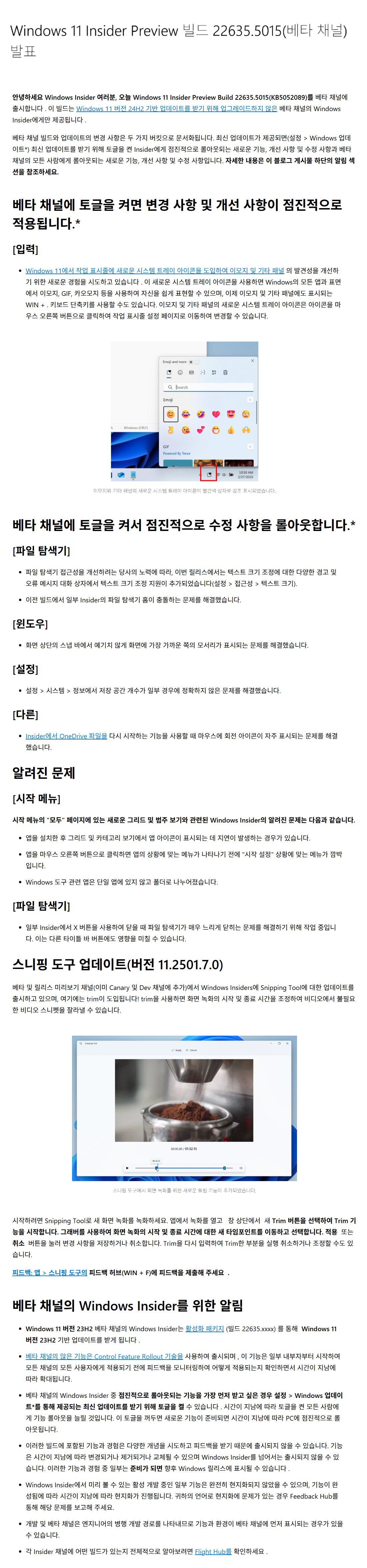 ○ 베타 채널 [Beta] = Windows 11 : 빌드 22635.5015 (= 참가자 빌드)