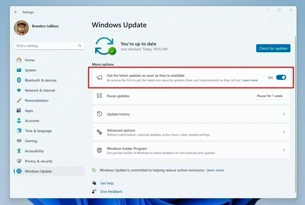 점진적으로 출시되는 기능을 가장 먼저 받아보고 싶은 베타 채널의 Windows 참가자의 경우 토글(아래 이미지 참조)을 켜서 설정 > Windows 업데이트를 통해 제공되는 최신 업데이트를 받을 수 있습니다