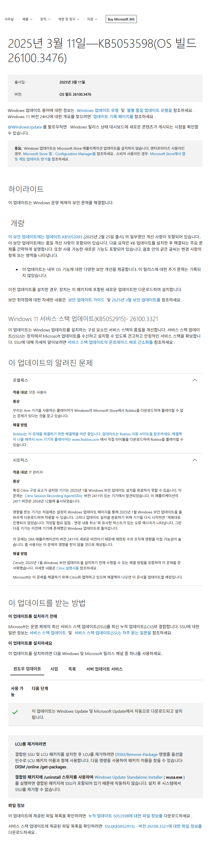 KB5053598 = 최신 누적 업데이트(26100.3476) (Last Cumulative update : LCU) (2025-03-11)