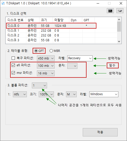 7) T.Diskpart 사용 방법 (GPT=UEFI, MBR=BIOS 파티션 만들어주는 프로그램)