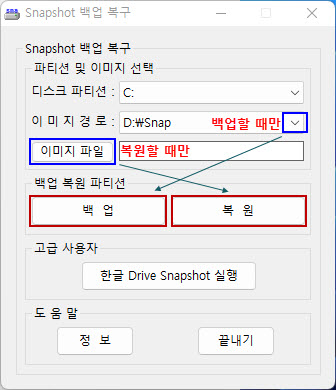 2) 이미지 경로 : D:\Snap ← 백업 이미지를 저장할 폴더 (백업할 때만 사용) : 파일명은 자동으로 만들어짐