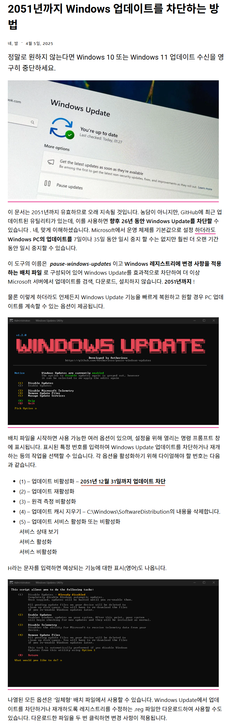 - 레지스트리 파일은 레지스트리에서 직접 업데이트 블록을 설정하거나 제거합니다. 배치 파일을 통해서만 선택할 수 있습니다.