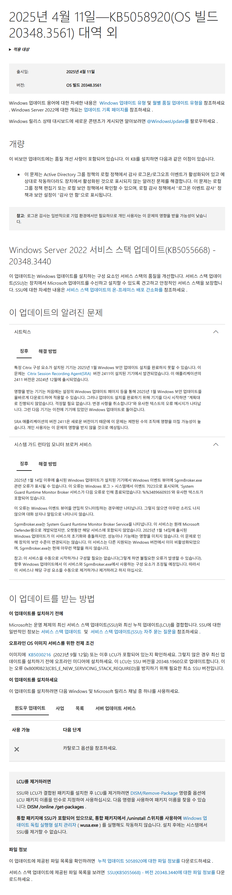 KB5058920 = 최신 누적 업데이트(20348.3561) (Last Cumulative Update : LCU) (2025-04-11)