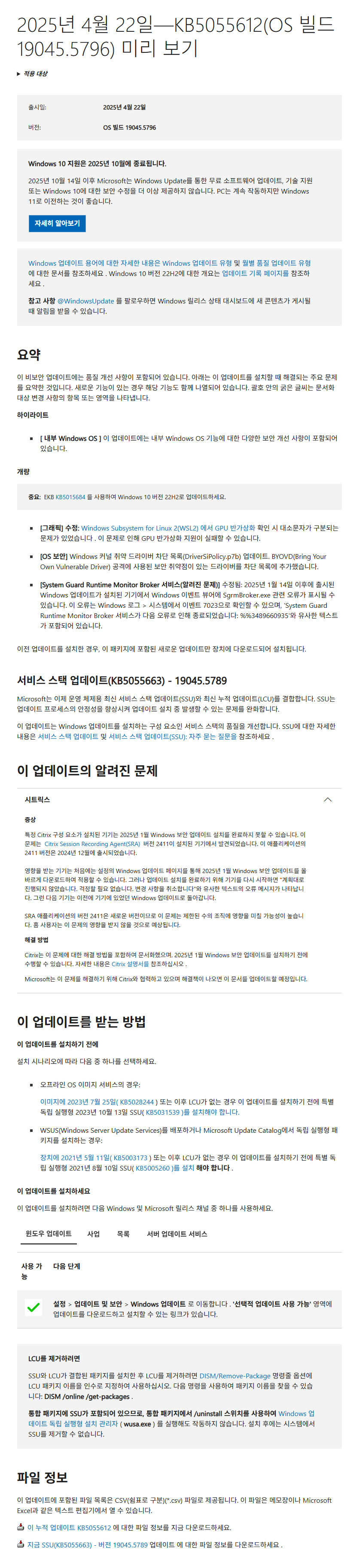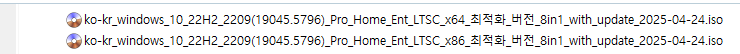 KB5055612 = 최신 누적 업데이트(19044.5796 / 19045.5796) (Last Cumulative update : LCU) (2025-04-22)
