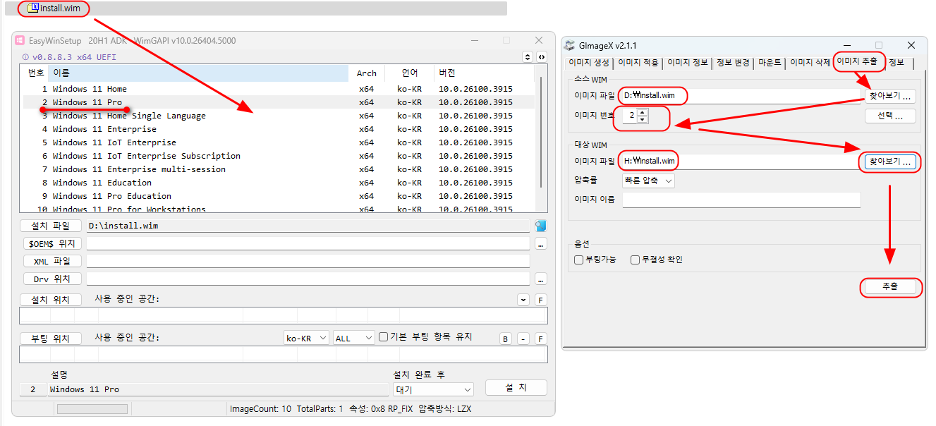 2) EasyWinSetup. 프로그램을 실행후 install.wim 파일을 끌어넣으면 위 그림처럼 원하는 인덱스 번호를 알수 있습니다.