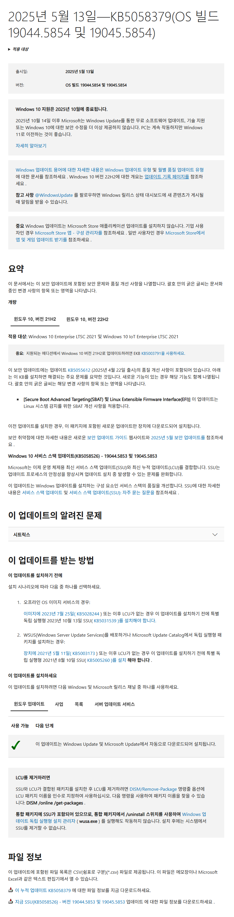 KB5058379 = 최신 누적 업데이트(19044.5854 / 19045.5854) (Last Cumulative update : LCU) (2025-05-13)