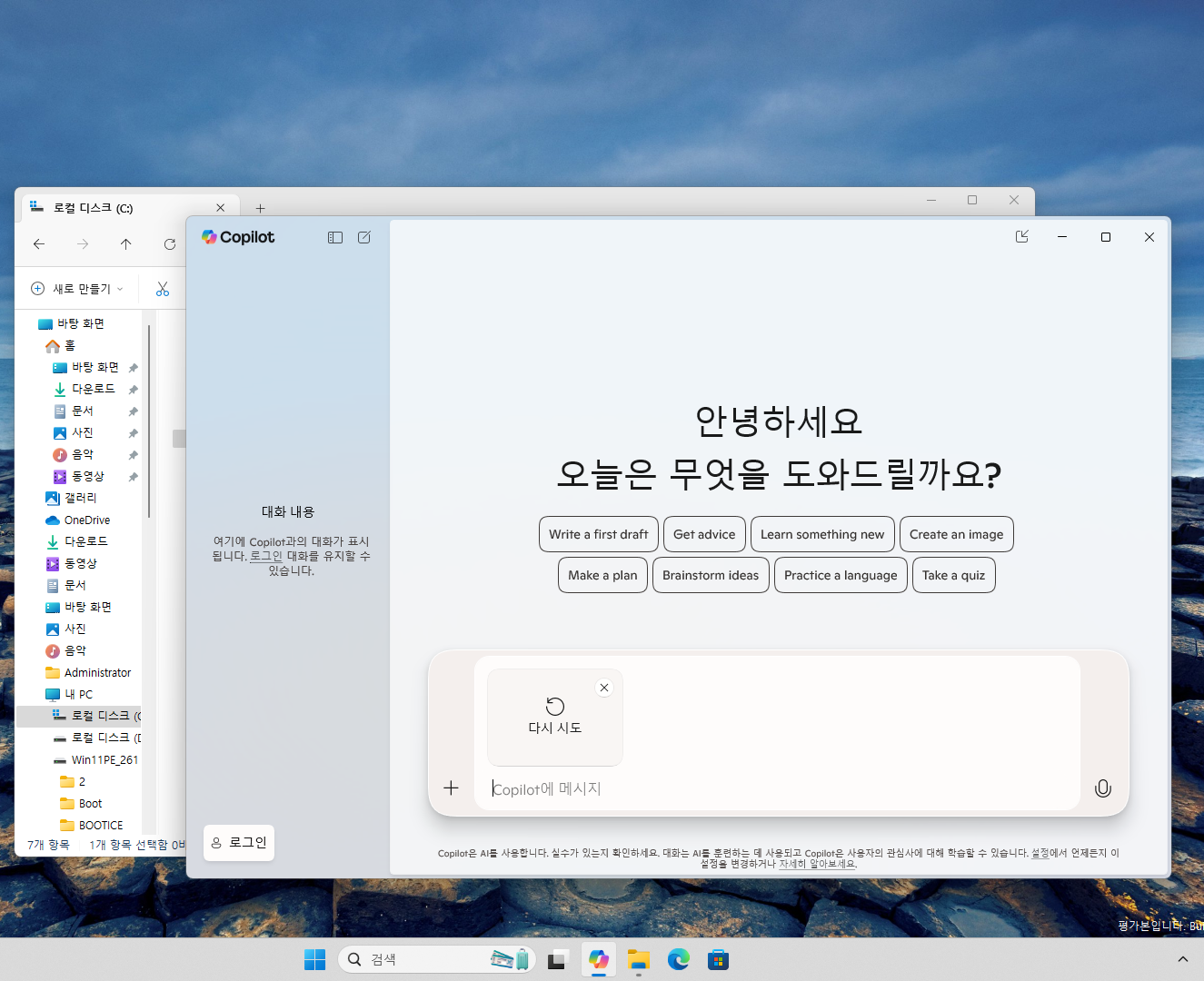 메뉴 눌렀더니 아래 처럼 Copilot가 잘 실행됩니다...