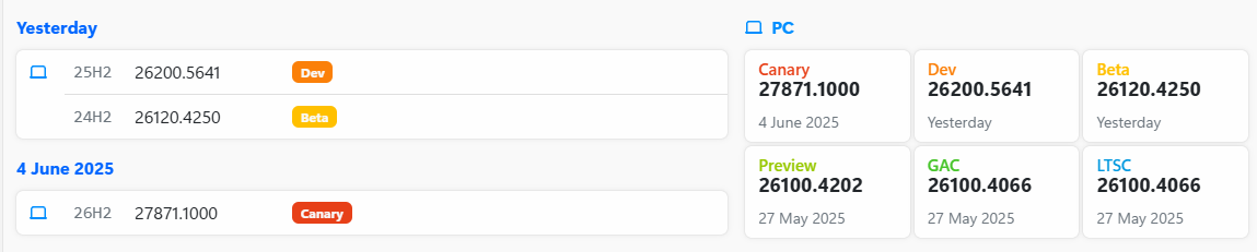 ○ 개발자 채널 [Canary] = Windows 11 26H2 : 빌드 27871.1000 (= 참가자 빌드)