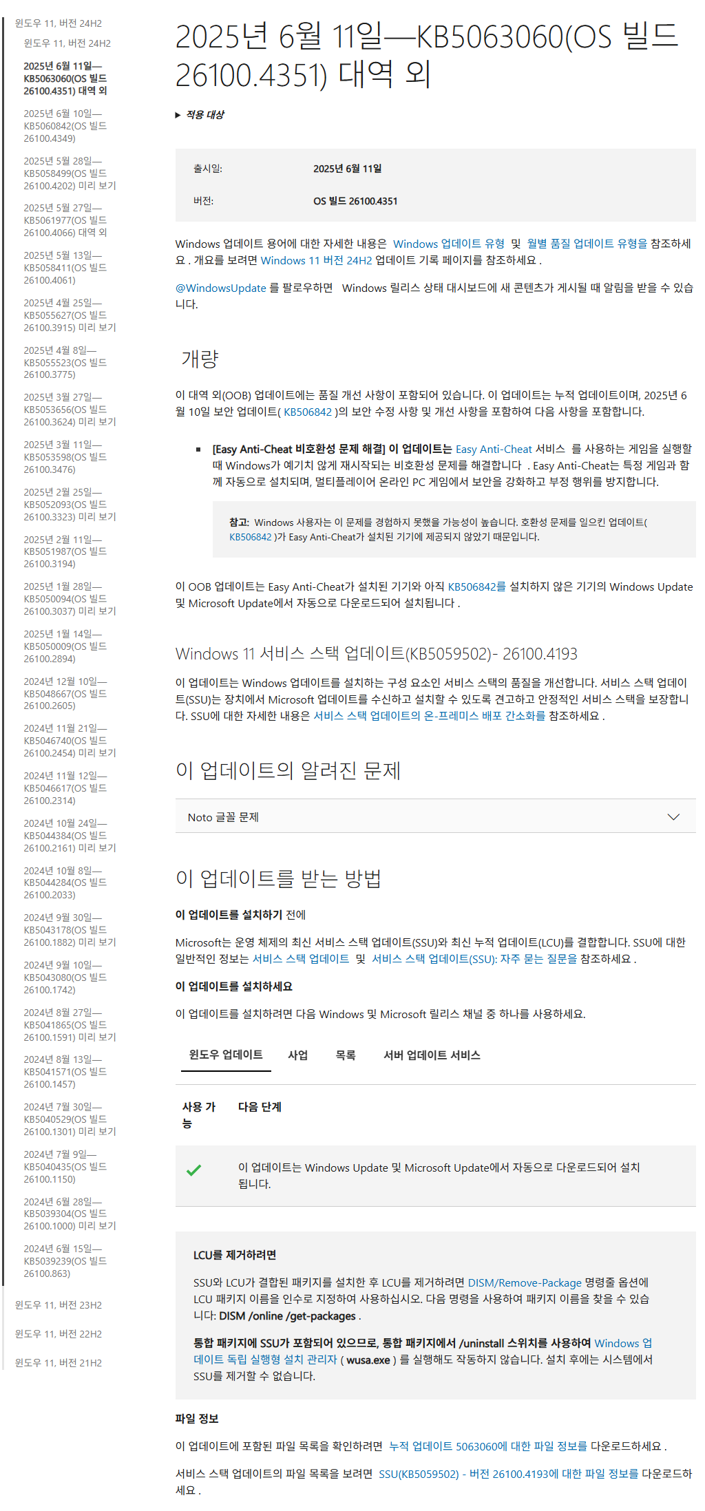 KB5063060 = 최신 누적 업데이트(26100.4351) (Last Cumulative update : LCU) (2025-06-11)