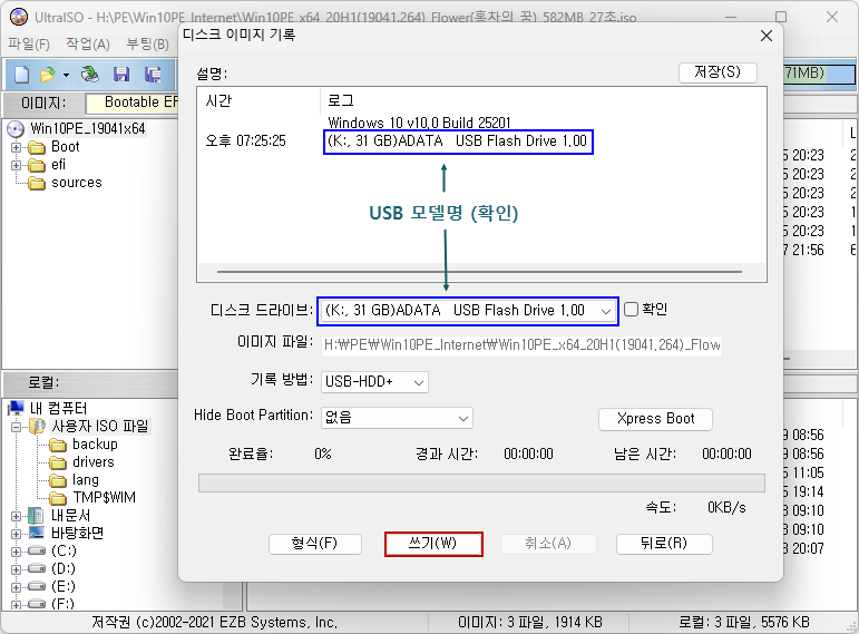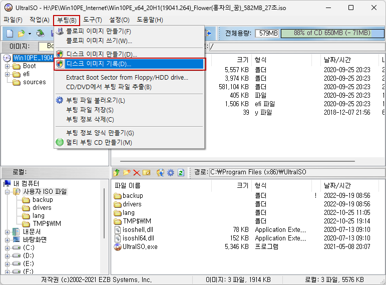 3) 메뉴에서 → 부팅 → 디스크 이미지 기록 → 쓰기