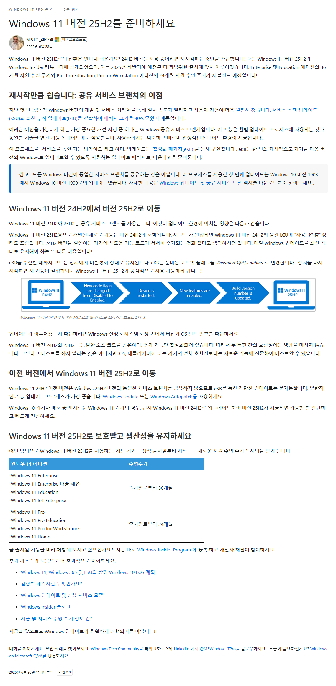 24H2 사용자들은 기능업데이트 패키지만 설치하면 25H2로 쉽게 갈아탈 수 있습니다...
