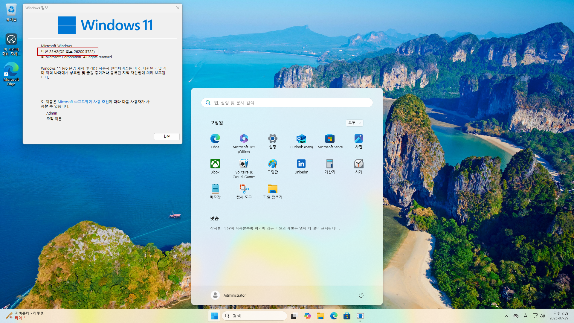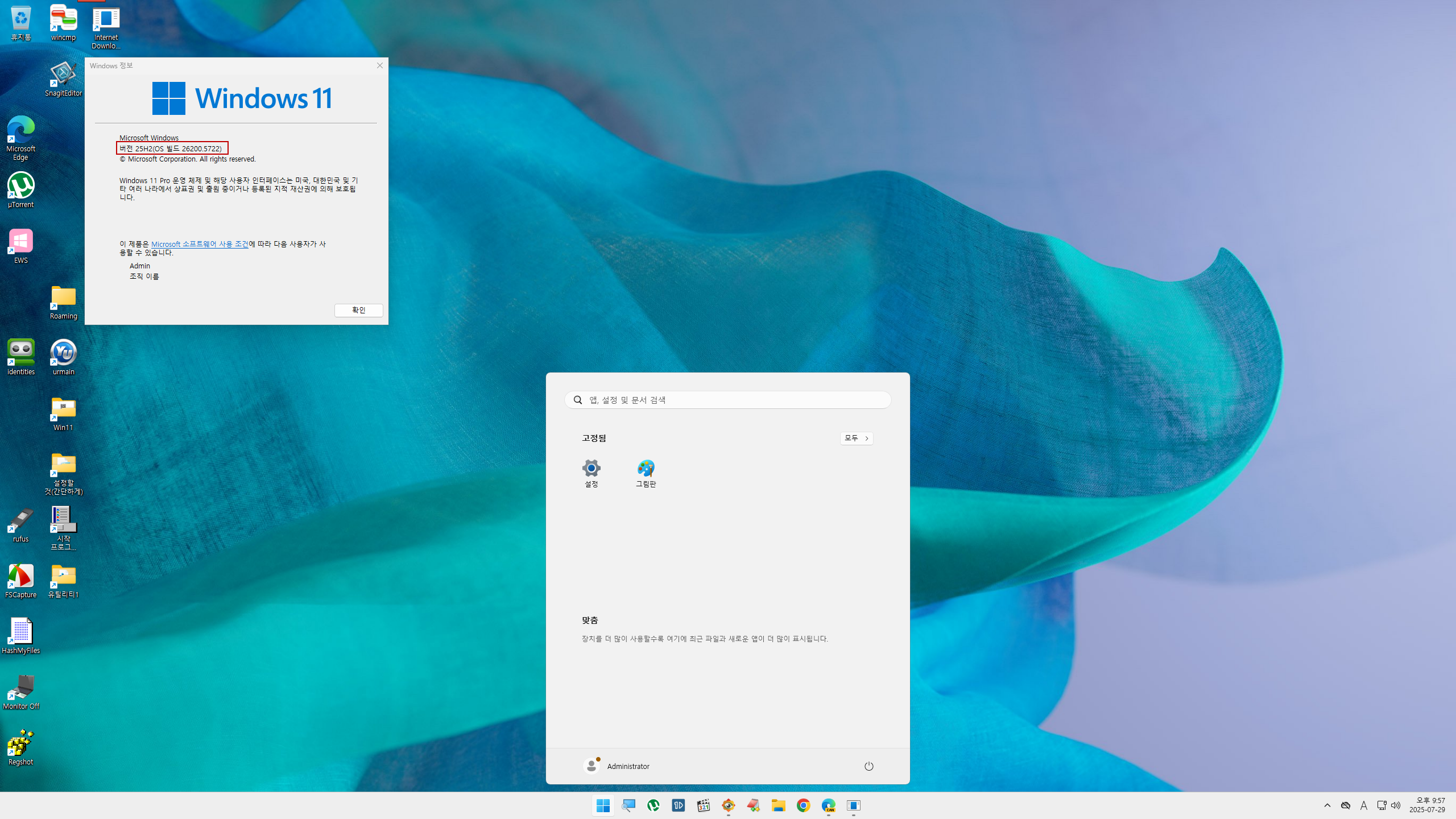 4. 재부팅후 빌드 번호 (Windows 11 25H2 빌드 26200.5722) ㅋㅋㅋ