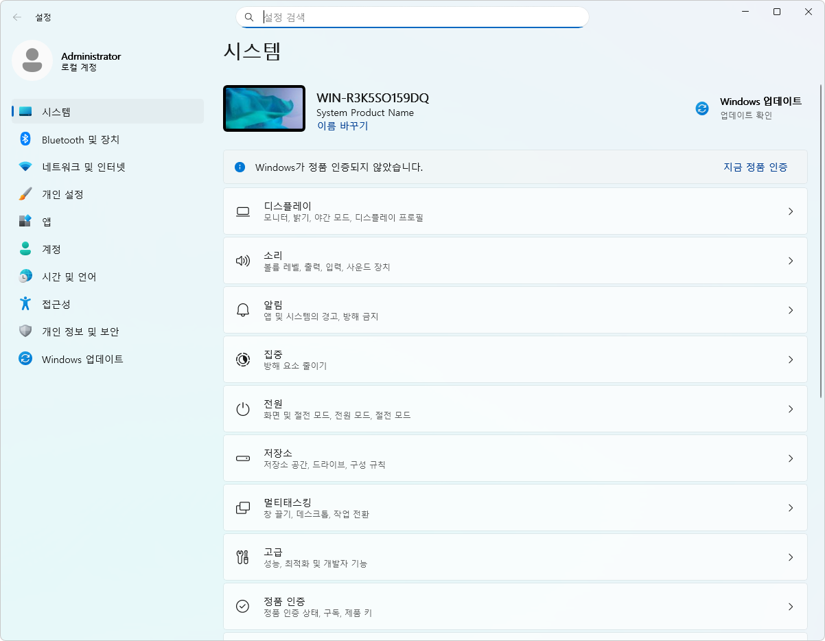 설정창의 [검색]란이 상단 중앙으로 이동되어 있습니다.