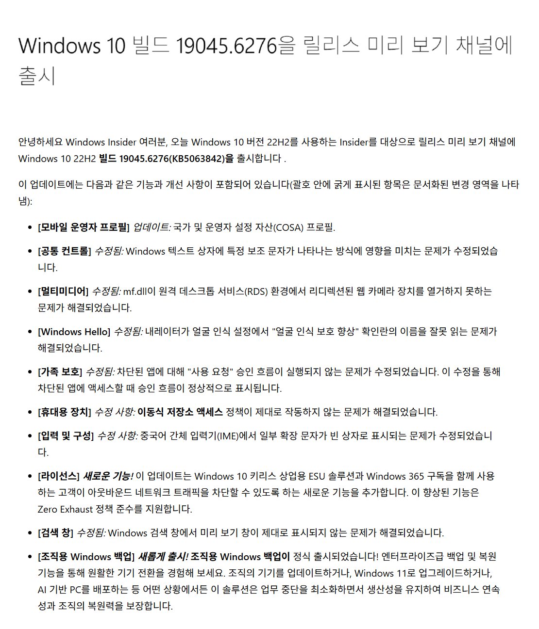 - Release Preview 채널 – 일반 사용자 대상 최종 테스트 단계