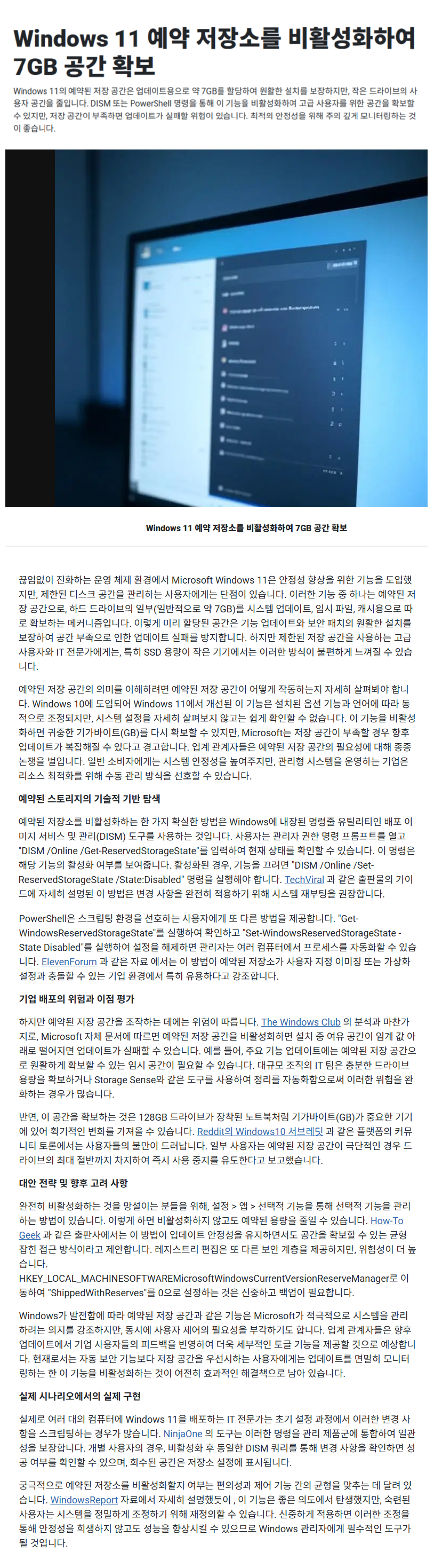 - 시스템 안정성에는 큰 영향은 없지만, 예약 공간을 끄면 업데이트 설치 시 디스크 부족 문제가 발생할 수 있음.