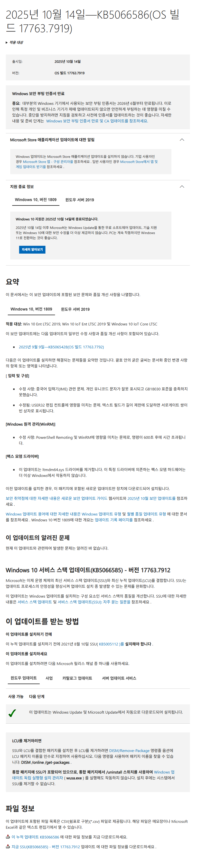 KB5066586 = 최신 누적 업데이트(17763.7919) (Last Cumulative Update : LCU) (2025-10-14)