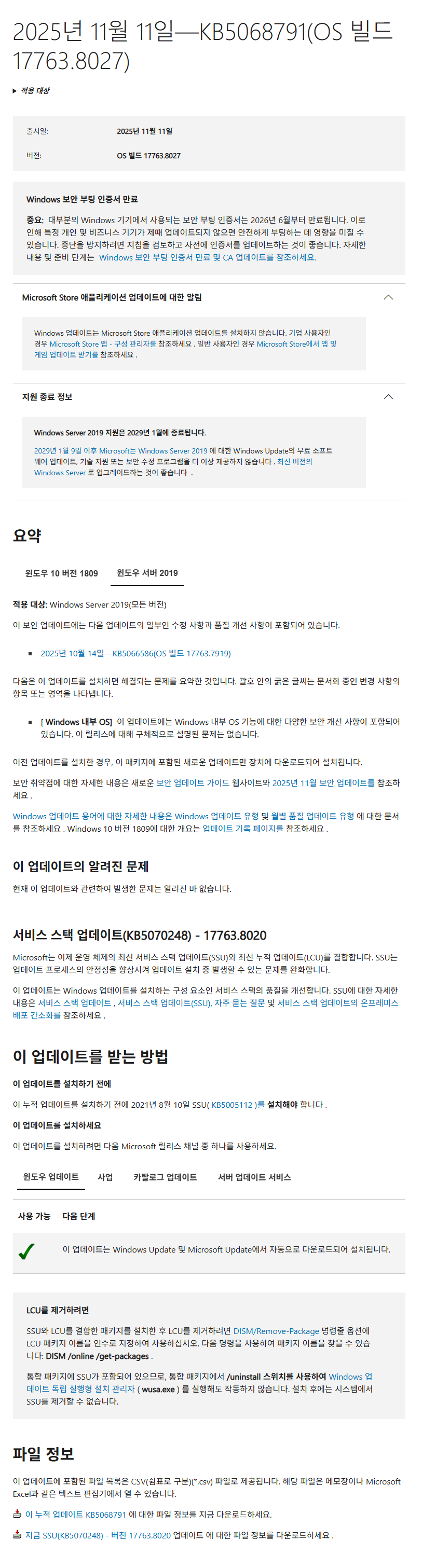 KB5068791 = 최신 누적 업데이트(17763.8027) (Last Cumulative Update : LCU) (2025-11-11)