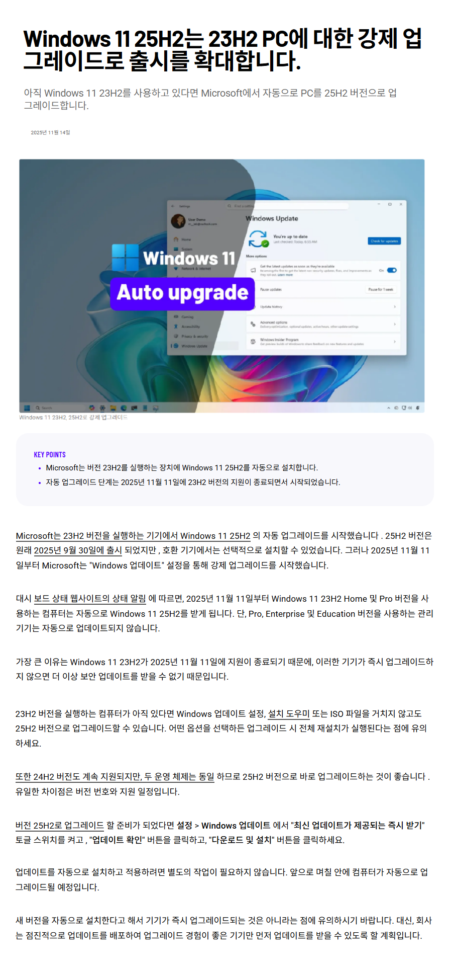 Windows 11 23H2 PC에 대한 25H2로 강제 업그레이드가 시작되었다고 합니다....