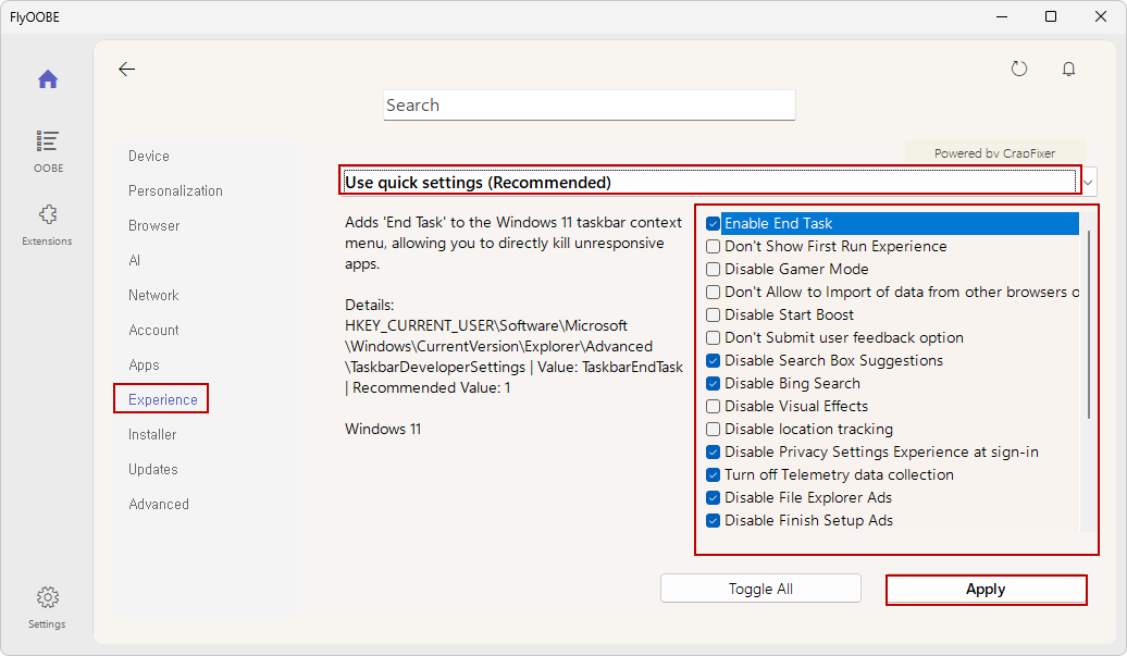 | 플라이OOBE 2.2 | 업그레이드 + OOBE 툴킷 | • Windows 10 → 11 업그레이드 • 전체 OOBE 사용자 지정 • 조정 및 디블로트 도구 • 스크립트 가능한 설치 확장 |