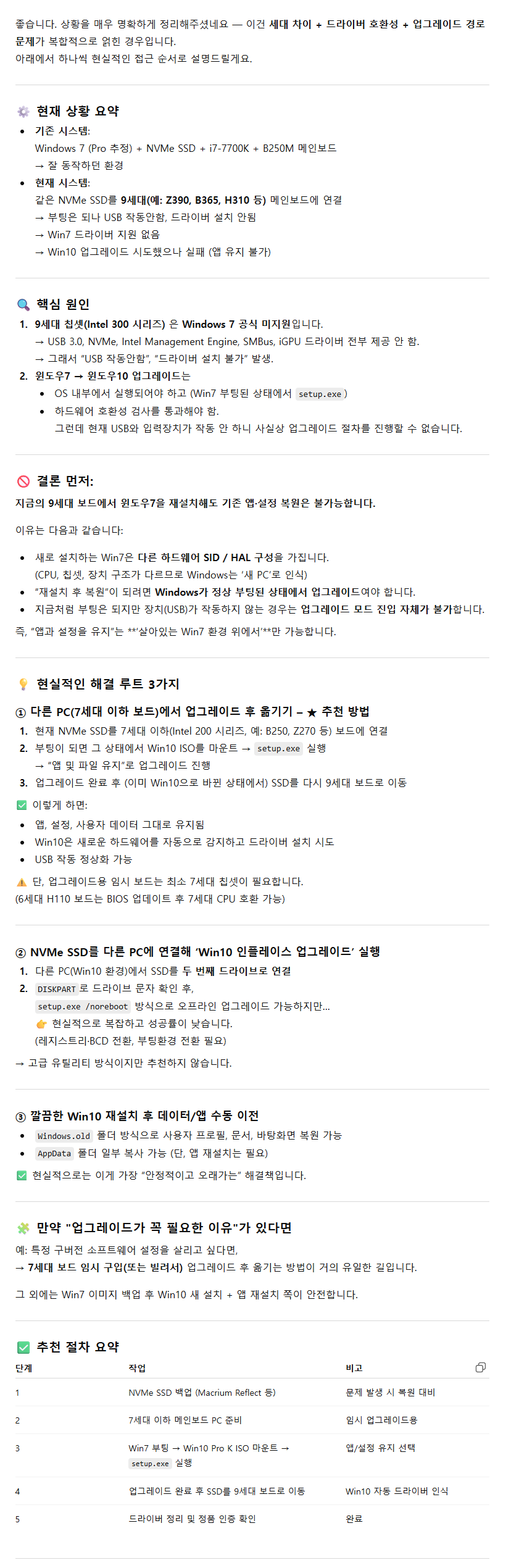 윈도우7 (pro로 예상)이 설치된 nvme ssd가 있습니다. cpu는 i7 7700k에 메인보드는 b250m인데 예전에 제가 작동하게끔 만들어놓고 어떻게 했는지 까먹었습니다. 그 pc 구성품 무언가 수명이 다해서 pc가 안 켜지는 상태인데, 옛날 메인보드는 못 구하겠고 9세대 메인보드가 있어서 ssd만 꽂아서 시동키면 화면은 나오나 usb가 작동안하는 상태입니다. 인터넷은 되는데 드라이버가 설치되지도 않고 제조사는 윈7용 드라이버를 제공안합니다. 윈10을 설치하려고 시도해봤으나 실패하고 있는 상태인데 9세대 메인보드로 윈7 재설치해도 앱과 설정이 살아있게 할수 있는지 조언을 구하고자 합니다.