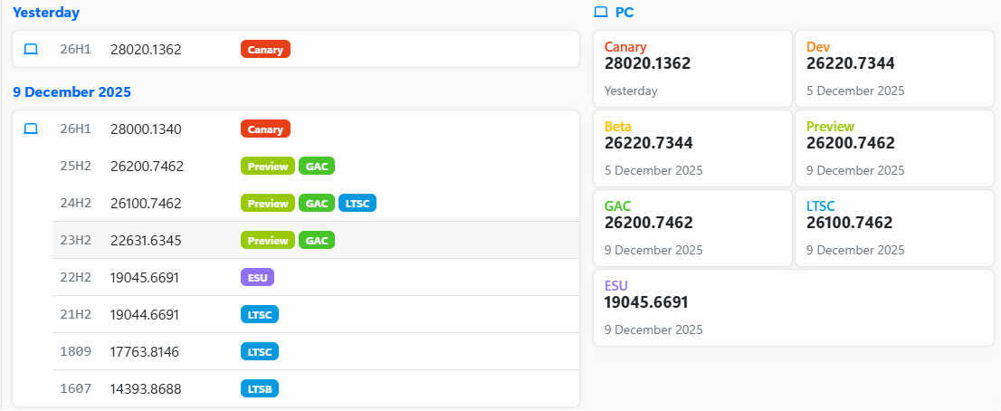 ○ 카나리아 채널 [Canary] = Windows 11 26H1 : 빌드 28020.1362 (= 참가자 빌드)