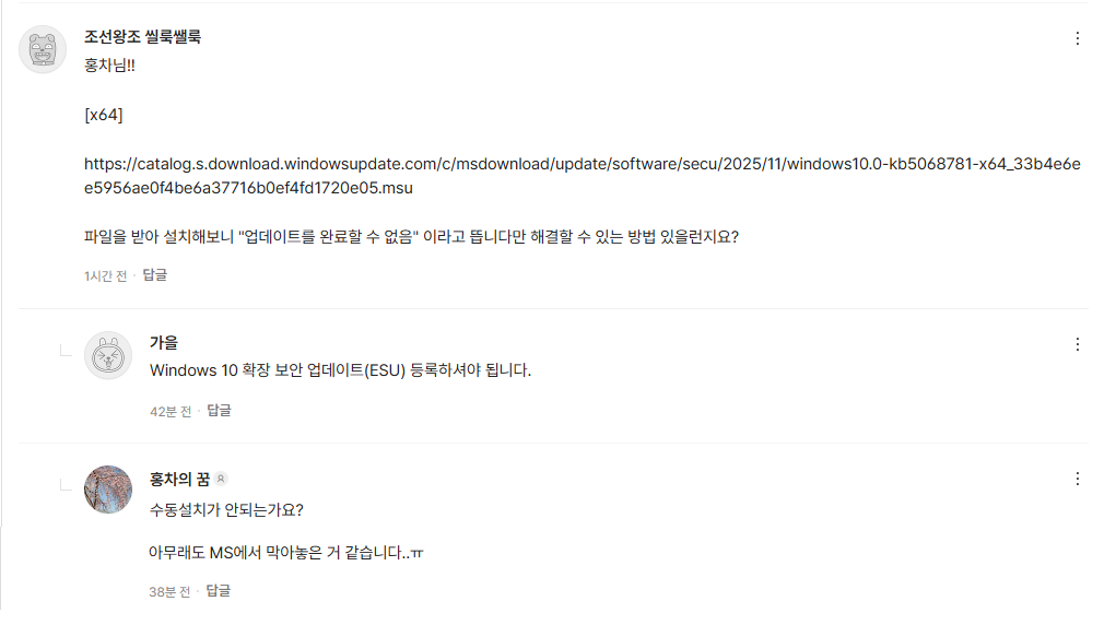 Windows 10 지원 종료에 따라, 수동 설치도 안되는 것 같습니다.ㅠ