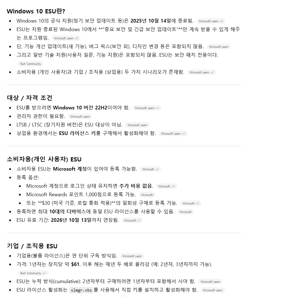 링크 Microsoft 지원 - “Windows 10 대한 ESU(확장 보안 업데이트) 프로그램” – Microsoft Learn 한국어 문서
