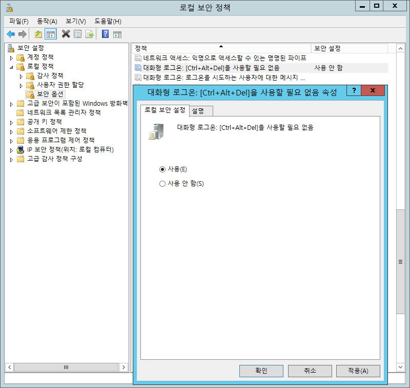 오른쪽 패널에서대화형 로그온 : [CTRL+ALT+DEL]을 사용할 필요 없음 → 사용 → 확인