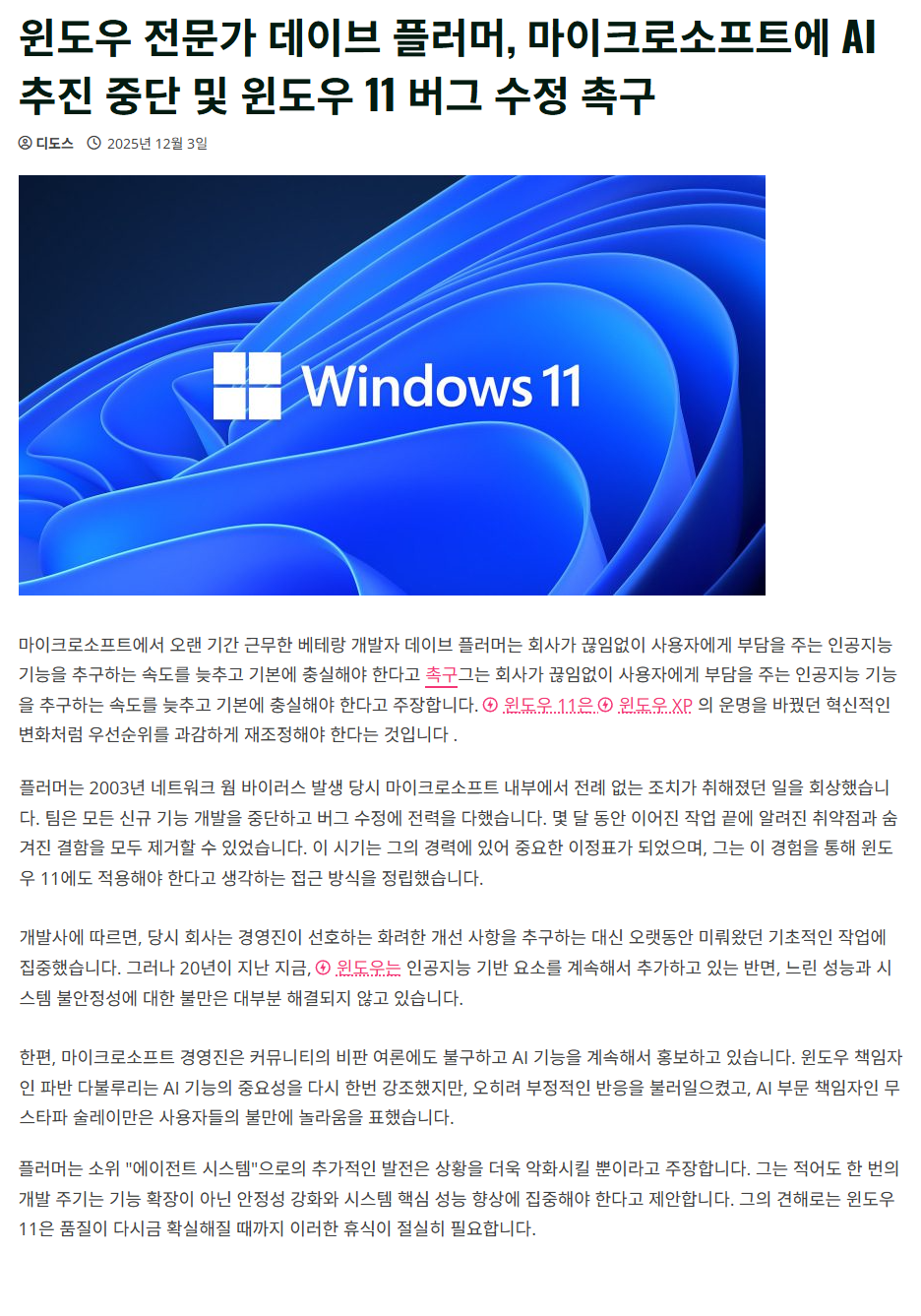 | MS는 왜 AI에 집착하고 기본에 충실한 가벼운 Windows 11을 출시하지 않는 걸까요? (0) | 2025.12.26 |